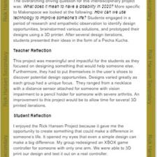 This project was meaningful and impactful for the students as they focused on designing something that would help someone else. Furthermore, they had to put themselves in the user’s shoes to discover potential design opportunities. Designs varied greatly as each group had a unique focus. They ranged from a necklace with a distance sensor attached for someone with vision impairment to a pencil holder for someone with severe arthritis. An improvement to this project would be to allow time for several 3D printed iterations.
