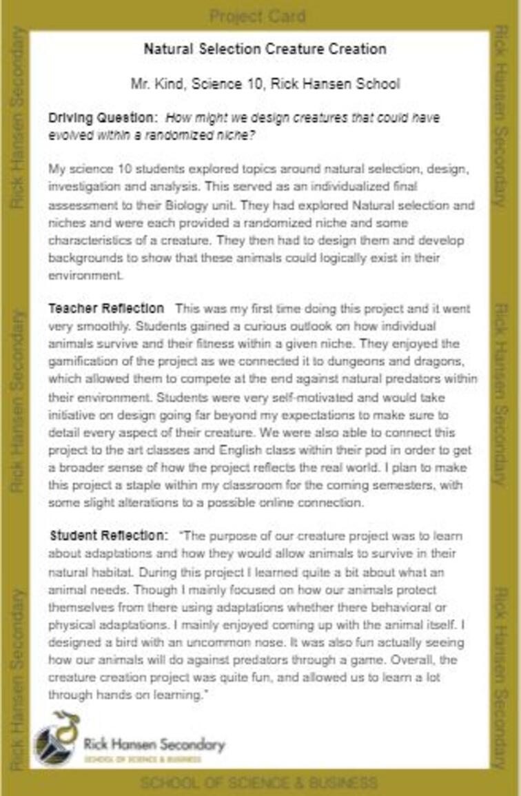 Spotlight on Learning: Natural Selection Creature Creation: Mr. Kind, Science 10, Rick Hansen School