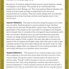 Teacher Reflection: This was my first time doing this project and it went very smoothly. Students gained a curious outlook on how individual animals survive and their fitness within a given niche. They enjoyed the gamification of the project as we connected it to dungeons and dragons, which allowed them to compete at the end against natural predators within their environment. Students were very self-motivated and would take initiative on design going far beyond my expectations to make sure to detail every aspect of their creature. We were also able to connect this project to the art classes and English class within their pod in order to get a broader sense of how the project reflects the real world. I plan to make this project a staple within my classroom for the coming semesters, with some slight alterations to a possible online connection.